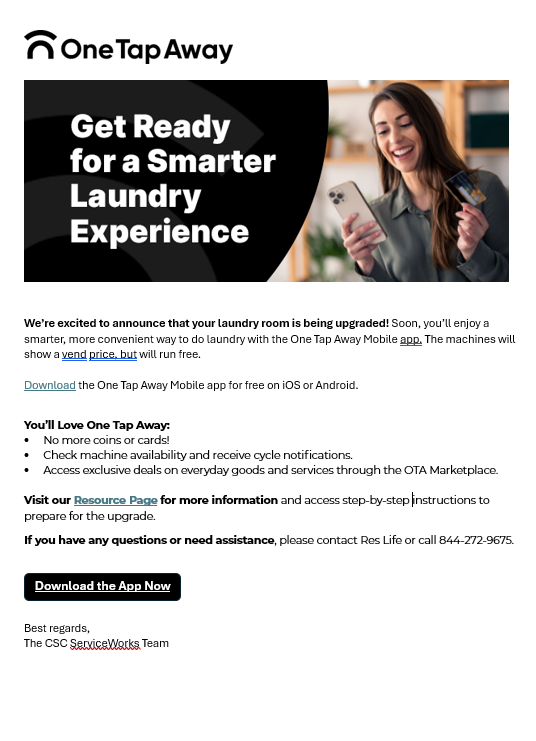 This flyer can be displayed in the laundry room to let students know the laundry room will soon transition to One Tap Away.