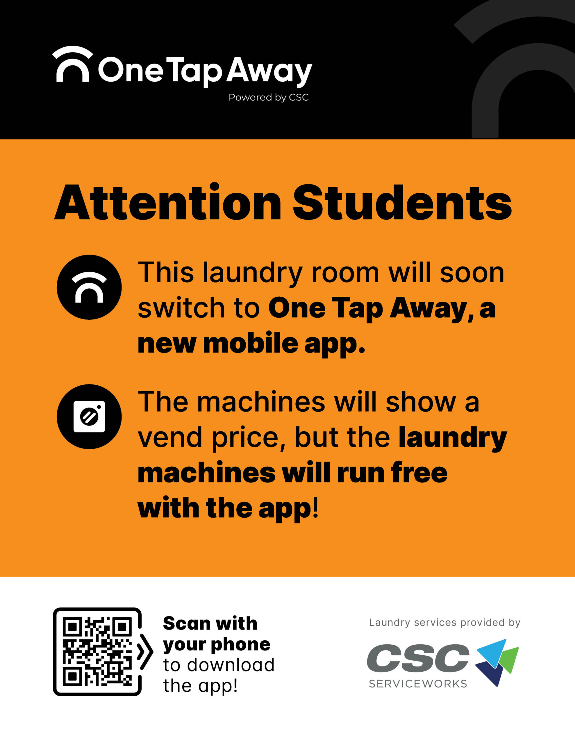 This poster will be hung in the laundry room by CSC personnel. It introduces One Tap Away to students with information on how to download, and benefits of using the app. If you need a replacement or additional posters, you can order more here.